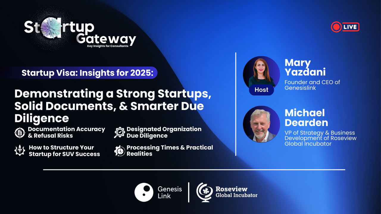 In this Startup Gateway webinar hosted by Mary Yazdani (GenesisLink) with guest speaker Michael Dearden (Roseview Global Incubator), the discussion focused on what actually makes a Start-Up Visa (SUV) file credible — from precision documentation and designated-organization due diligence to remote traction proof, hiring plans, and proactive file management during long processing timelines.